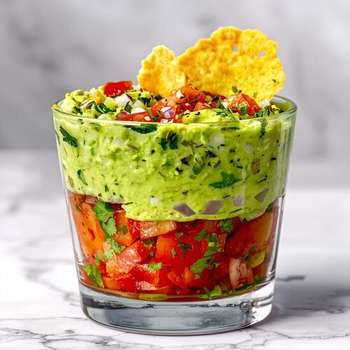 • 1ère couche : guacamole (avocat, citron, coriandre, oignon rouge).