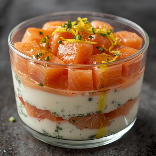 • Alternez des couches de fromage et de saumon fumé en dés.