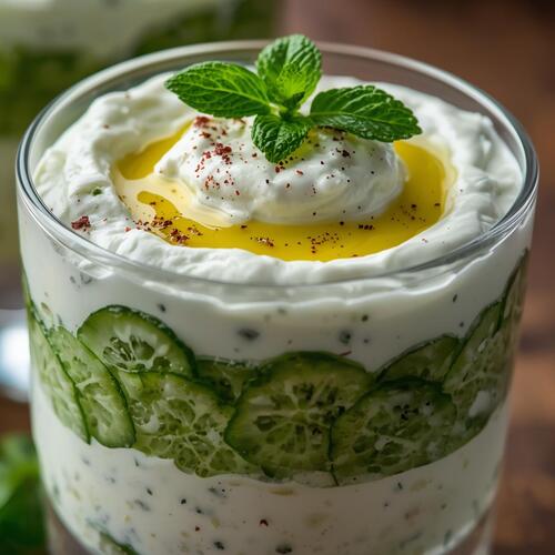• Mélangez avec du yaourt grec, ail écrasé, sel, poivre et menthe fraîche.