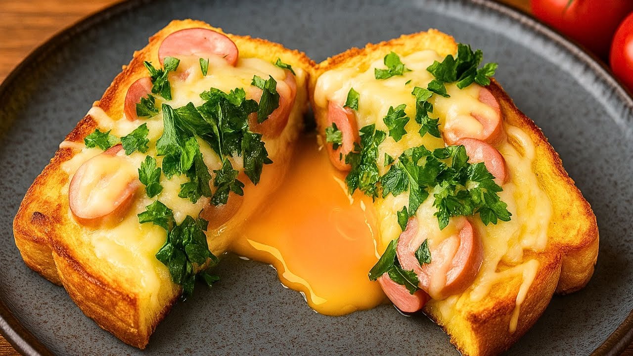 🍞🍳 Petit-déjeuner express au pain, œuf, saucisse et fromage (prêt en 5 minutes) Quand le temps manque mais que l’envie…