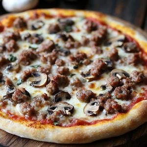 La pizza est un plat universel, apprécié pour sa polyvalence et sa capacité à se personnaliser selon les goûts de chacun. Cette version aux saucisses et champignons combine la richesse et le goût prononcé des saucisses avec la douceur et la texture des champignons frais, le tout sublimé par une sauce tomate parfumée et une généreuse couche de mozzarella fondante. Parfaite pour un dîner convivial entre amis ou en famille, cette pizza apportera à votre table une explosion de saveurs à chaque bouchée.