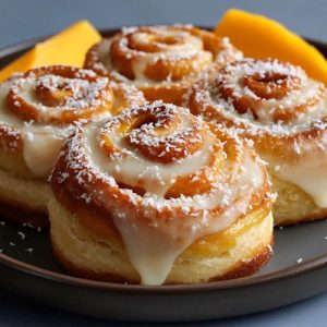 Les roulés briochés sont déjà une gourmandise irrésistible… mais lorsqu’ils se marient à la douceur tropicale de la mangue et au parfum chaud de la noix de coco, ils deviennent un véritable voyage culinaire. Cette recette vous propose des roulés moelleux et fondants, garnis d’une marmelade maison mangue–coco légèrement caramélisée, puis nappés d’un glaçage délicat qui apporte une touche finale brillante et parfumée.