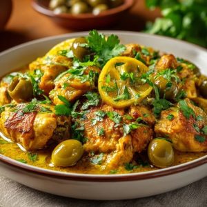 Le tajine de poulet aux olives vertes et citron confit est l’un des plats emblématiques de la cuisine marocaine : parfumé, ensoleillé, délicatement épicé. Le safran apporte une chaleur profonde, les olives une touche salée et le citron confit cette acidité unique qui équilibre l’ensemble. C’est un plat familial, simple et riche à la fois, qui mijote doucement jusqu’à ce que le poulet devienne tendre et irrésistible. Voici une version détaillée, parfaite pour obtenir un tajine authentique, généreux et parfumé comme au Maroc.