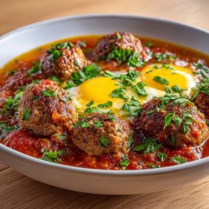 Tajine de Boulettes de Bœuf aux Œufs, Sauce Tomate Épaisse et Persil