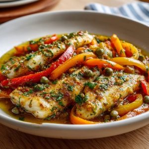 Le tajine de poisson est un plat lumineux, parfumé et d’une simplicité déconcertante. Dans cette version méditerranéenne, le poisson blanc se mêle aux poivrons colorés, aux câpres salines et à la fraîcheur du citron. L’origan apporte une touche aromatique subtile, tandis que les tomates cerises fondent doucement pour créer une sauce légère et parfumée. C’est un plat équilibré, idéal pour un repas sain, rapide et chaleureux, parfait aussi bien en semaine que pour recevoir.