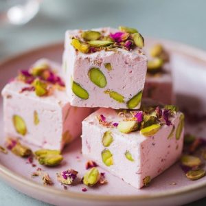 Le nougat à la pistache et à la rose est une confiserie délicate, inspirée des saveurs orientales. Il marie la douceur du miel, le croquant des pistaches légèrement grillées et la subtilité florale de l’eau de rose. C’est une gourmandise parfaite pour les fêtes, les cadeaux faits maison ou simplement pour accompagner un thé parfumé. La recette demande un peu de précision, notamment pour la cuisson du sucre, mais le résultat en vaut largement la peine : un nougat tendre, parfumé, et esthétiquement superbe avec ses notes rosées et ses pétales délicats.