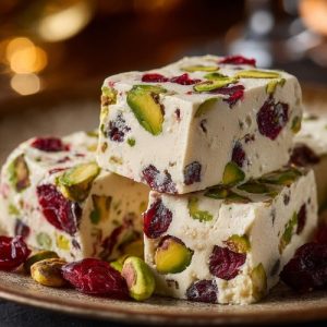 Le nougat est une confiserie délicate et raffinée, parfaite pour les fêtes ou pour offrir en cadeau gourmand. Cette version aux cranberries et pistaches allie le croquant des fruits secs à la légère acidité des cranberries, créant un équilibre parfait de saveurs et de textures. Facile à préparer à la maison, ce nougat est un vrai plaisir à partager avec vos proches ou à déguster au coin du feu avec une tasse de thé ou de café.