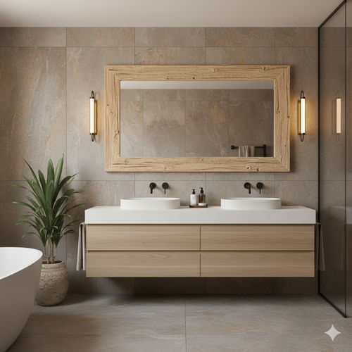 Le cadre du miroir reprend ses lettres de noblesse en 2026. Attendez-vous à des cadres épais, texturés et fabriqués à partir de matériaux naturels ou bruts comme le bois massif, le métal brossé (laiton, noir mat), ou même des finitions imitant la pierre ou le béton. Ces cadres apportent une sensation de chaleur, d’ancrage et une touche artisanale qui contraste avec la modernité du verre.