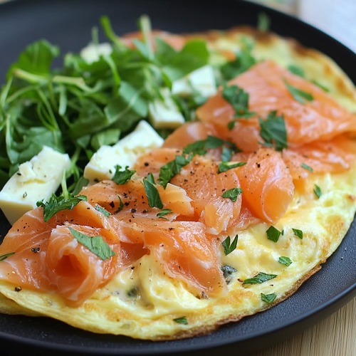 Omelette au Saumon Fumé et Fromage Frais — Douceur Crémeuse et Saveurs Marines Si vous cherchez une omelette élégante, fondante…