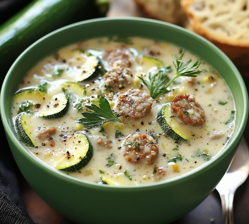 🍲 Soupe Crémeuse au Parmesan, Courgettes et Saucisse Italienne : un bol de réconfort à l’italienne Imaginez une soupe onctueuse…