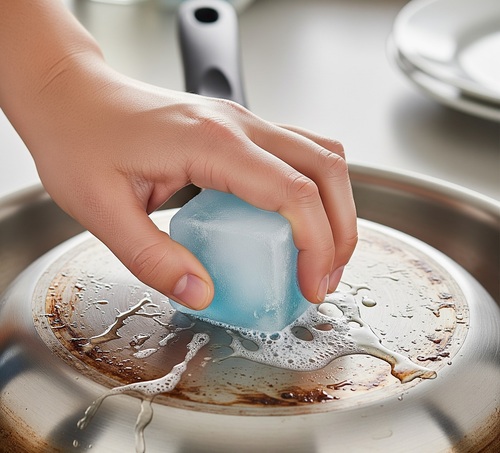 Les casseroles et poêles encrassées après la cuisson peuvent être difficiles à nettoyer. Vous pouvez placer un glaçon de liquide vaisselle dans l’eau chaude que vous utilisez pour faire tremper vos casseroles. Cela permettra au produit de se dissoudre lentement, facilitant le dégraissage et rendant le nettoyage beaucoup plus facile sans avoir à ajouter constamment plus de liquide vaisselle.