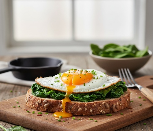Étalez les épinards sur le toast et déposez l’œuf par-dessus.