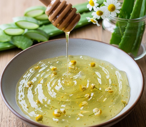 Dans un bol, mélangez le gel d’aloe vera et l’infusion de camomille.