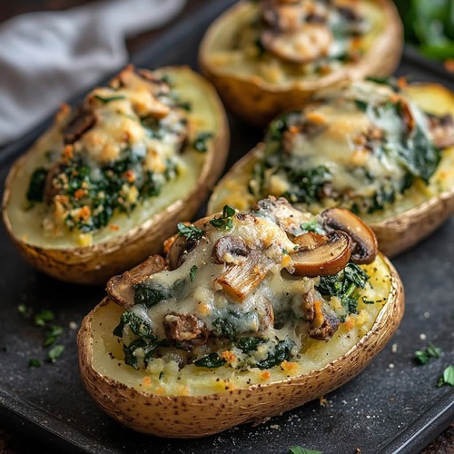Les pommes de terre farcies aux champignons et aux épinards sont un plat végétarien savoureux et réconfortant. La douceur des pommes de terre rôties, combinée à la richesse des champignons et à la fraîcheur des épinards, crée une farce onctueuse et parfumée. Le fromage gratiné sur le dessus apporte une touche dorée et fondante qui rend ce plat irrésistible. Idéal pour un dîner familial, un repas végétarien ou même un buffet festif, ce plat allie simplicité, gourmandise et équilibre.