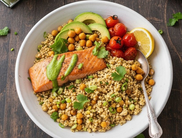 En base de bowl : ajoutez avocat, pois chiches, légumes rôtis et sauce tahini.