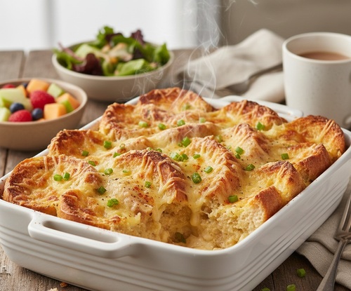 Le petit déjeuner est souvent considéré comme le repas le plus important de la journée, et il mérite d’être à la fois nutritif et gourmand. Que vous ayez envie d’un plat réconfortant à partager en famille ou d’un en-cas rapide et croustillant, ces deux recettes vous feront démarrer la journée avec énergie et saveur. La première, une casserole salée façon pain perdu, combine douceur, onctuosité et fromage fondant. La seconde, des sandwichs panés au fromage et au jambon, apporte un contraste croustillant et fondant à souhait. Voici le détail de ces deux recettes simples mais irrésistibles.