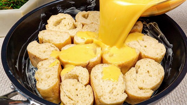 - Versez le mélange œufs/lait/fromage sur la baguette, en vous assurant que chaque tranche soit bien imbibée.