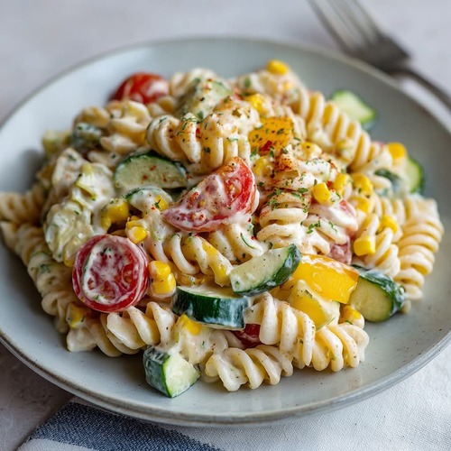 Dans cette version crémeuse, les pâtes tendres se marient parfaitement avec des légumes croquants et une sauce onctueuse à la mayonnaise et au citron, pour un équilibre idéal entre gourmandise et légèreté.