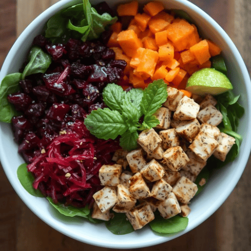 - Préparer les légumes : Lavez soigneusement les pousses d’épinards et la roquette. Coupez la betterave en petits dés et râpez la carotte.